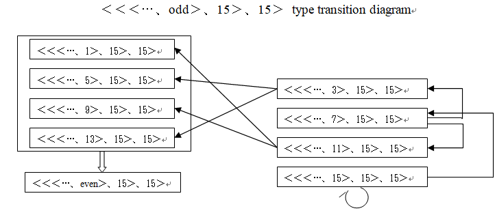 Transitions to Type 15 can occur from types other than Type 15. Examining the type transition diagram, at <even number, 9> – <t, 14>, when t is odd, it transitions to <u, 15>. Furthermore, at <odd number, 13> – <t, 12>, when t is odd, it transitions to <u, 14>. Additionally, when u is odd, it transitions to <v, 15>.