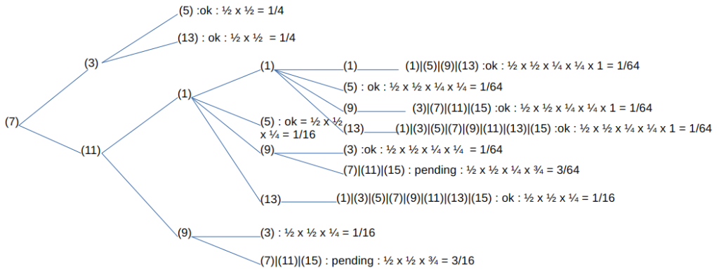 The <<…, 7>, 15> type becomes either <<…, 3>, 15> or <<…, 11>, 15> in the next operation. Then, as explained above, <<…, 3>, 15> becomes either <<…, 5>, 15> or <<…, 13>, 15> in the next operation, becoming <even number, 15> in the following operation, and transitioning to type 7 in the subsequent operation. Similarly, <<…, 11>, 15> becomes <<…, 13>, 15> in the next operation, becoming <even number, 15> in the following operation, and transitioning to type 7 in the subsequent operation. 13>, 15>, and then becomes in the next operation, transitioning to type 7 in the subsequent operation. Similarly, <<…, 11>, 15> becomes <<…, 1>, 15> or <<…, 9>, 15>, then becomes the <even number, 15> type, and can transition to type 7.