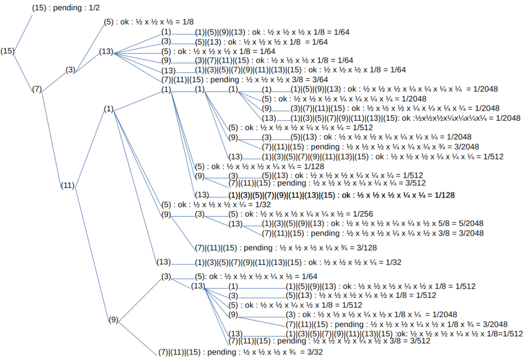 Reduction ratio:49/64 + (15/64 x 4/5 x 49/64 x 49/64 x 49/64 + 15/64 x 4/5 x 49/64 x 49/64 x 15/64) + 15/64 x 4/5 x 49/64 x 15/64 x 4/5 + 15/64 x 4/5 x 15/64 x 4/5 x 49/64 + 15/64 x 1/5 x 4/5 x 49/64 x 49/64 = 49/64 + 15/64 x 4/5 x 49/64 x 49/64 + 15/64 x 4/5 x 49/64 x 15/64 x 4/5 + 15/64 x 4/5 x 15/64 x 4/5 x 49/64 + 15/64 x 1/5 x 4/5 x 49/64 x 49/64 = 0.765625 + 0.109909 + (42x152x49 + 42x 152x49 + 4x15x492)/(52x643) = 0.765625 + 0.109909 + 0.04217 = 0.917703