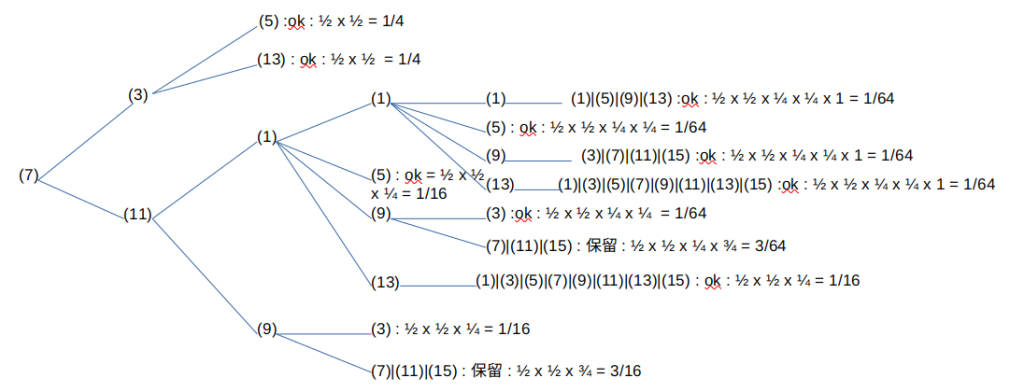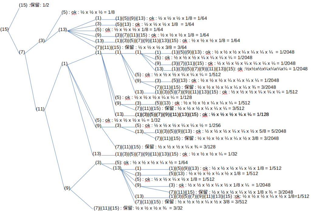 では、タイプ15が先頭に来る場合の計算をしてみよう。初めに、(7)|(15)に分岐して、分岐15は保留となる。タイプ7が続く時は1/2倍となる。保留となる場合を足していくと、1/2 + 3/64 + 3/2048 + 3/512 + 3/2048 + 3/128 + 3/2024 + 3/512 + 3/32 = 1393/2048となり、最初にタイプ8が来る割合は1/8なので、全体として1393/16384となる。