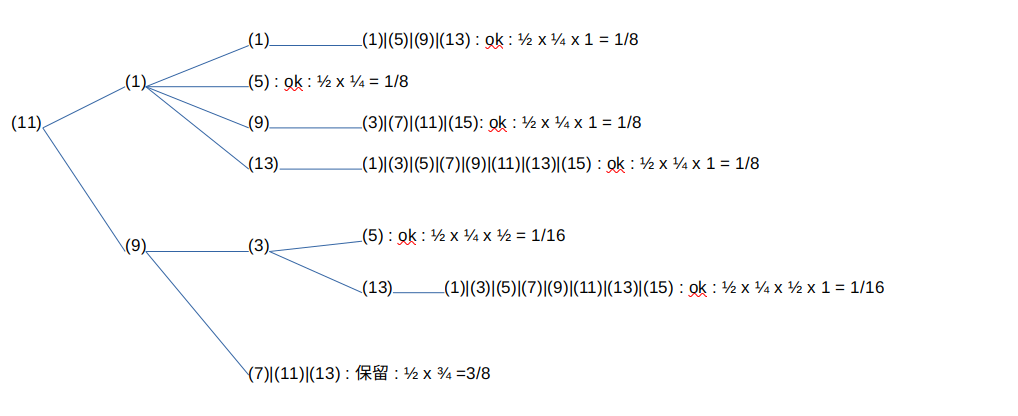 (7)(11)(1)(1)(13)-(1)|(3)|(5)|(7)|(9)|(11)|(13)|(15): 27/16 x 3/4 x (3/8) = 243/512 *13からの先の遷移についても考慮に入れている。