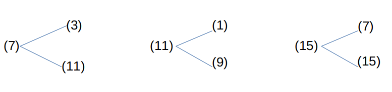 (15)(7)(11)(1)(1)については、更に(1)|(5)|(9)|(13)のいずれかに分岐するが3/4なので一気に出発点の整数よりも小さくなることは難しい。同じことは、(15)(7)(11)(1)(9)についても言える。(15)(7)(11)(1)(9)はその後(7)|(15)|(3)|(11)のいずれかに分岐し、拡大率は3/4である。